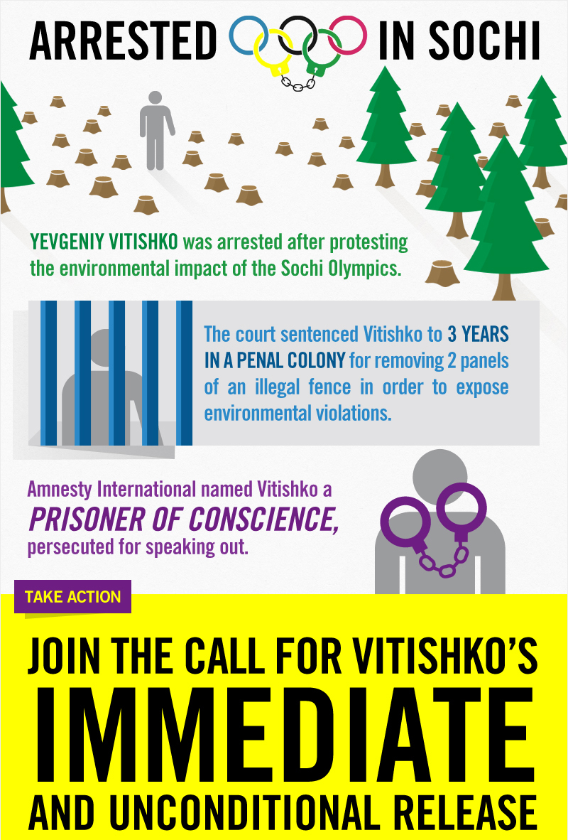 Yevgeny Vitishko is a prisoner of conscience, punished for exposing environmental damage around the construction of the Sochi Winter Olympics.
